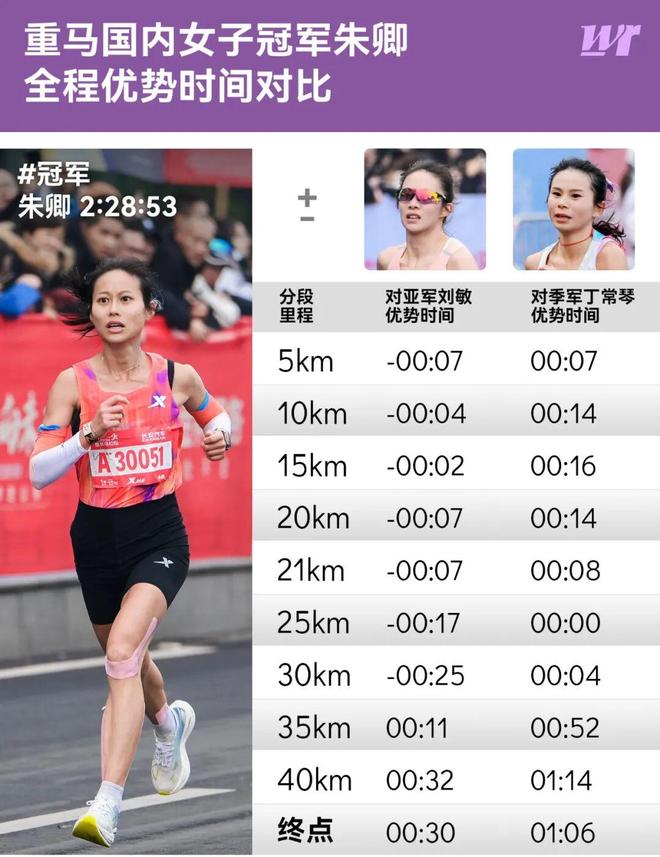 而此时的朱卿采取了更为稳健的跟随战术。25公里左右,丁常琴曾一度追上朱卿,两人短暂并肩,但在31公里处,朱卿甩开了丁常琴,独自向前方的刘敏发起冲击。